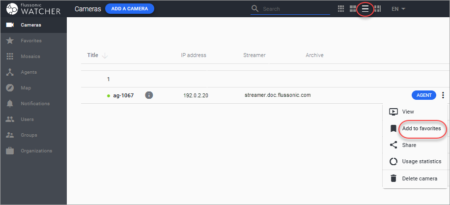 Alternatively, in List mode, click the More button next to the camera and choose Add to Favorites.