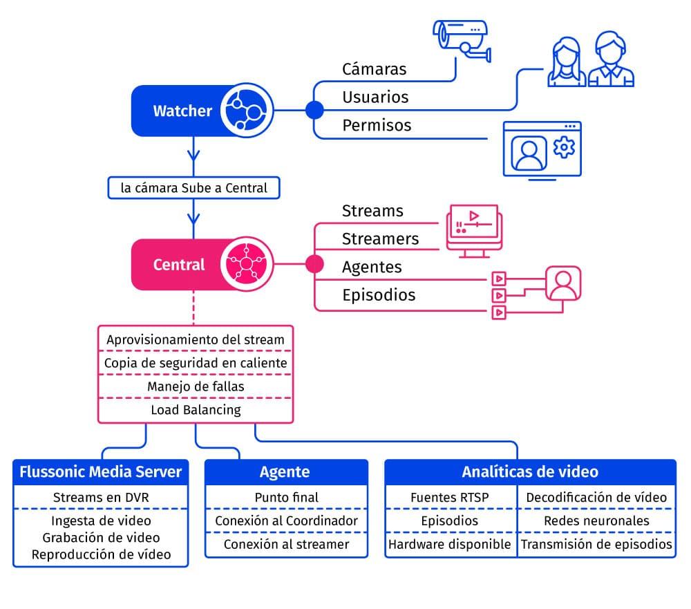 A partir de la última versión (versión 23.06), todas las instalaciones de Flussonic Watcher pasarán de la configuración de dos componentes "Watcher+Media Server" a una configuración de tres componentes: "Watcher VMS+Central+Media Server". Esto reducirá significativamente el consumo de recursos en instalaciones con 500 cámaras, garantizará una orquestación más eficiente y proporcionará redundancia para todos los componentes de Flussonic incluidos en la instalación de Watcher.