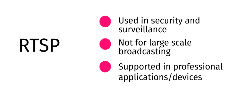 Limited Scalability: RTSP is generally better suited for one-to-one or one-to-few streaming scenarios, such as security cameras or video conferencing, and does not scale as efficiently for large audiences compared to HLS or DASH.