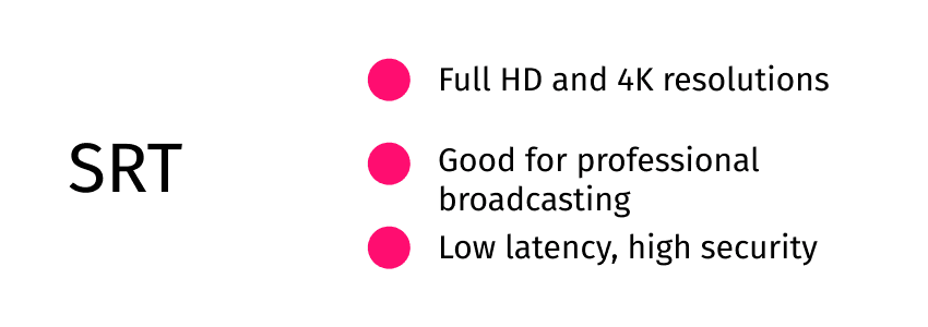 | SRT | Less than 2s | High | Medium | High | High | UDP |